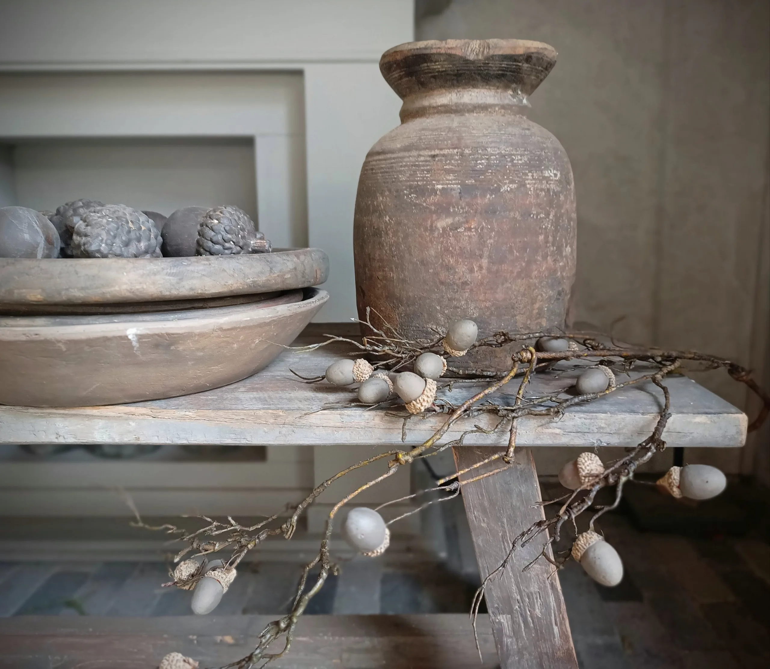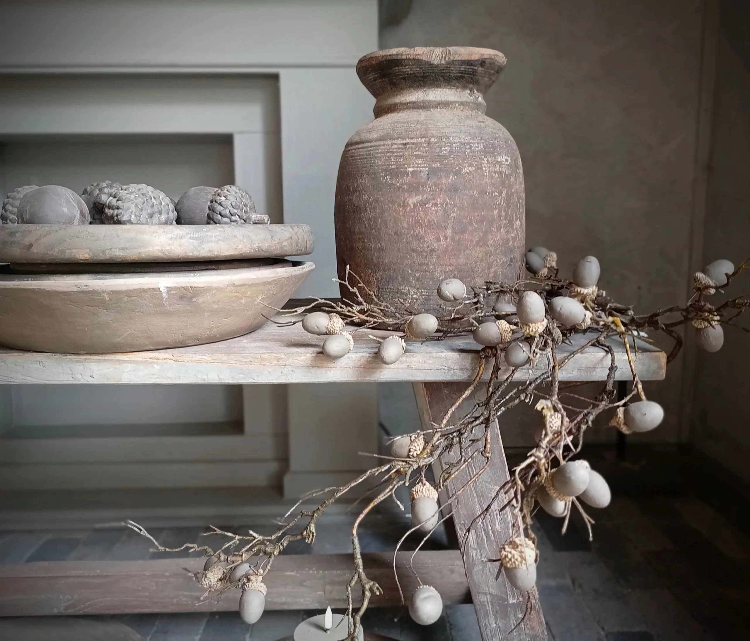 Prachtige grillig gevormde tak met diverse eikeltjes aan de takken (totaal 15 eikeltjes). De tak heeft diverse zijtakken. De lengte van de tak met uitlopers is ongeveer 89 cm. De kleur van de eikeltjes is in een grijs bruine tint.