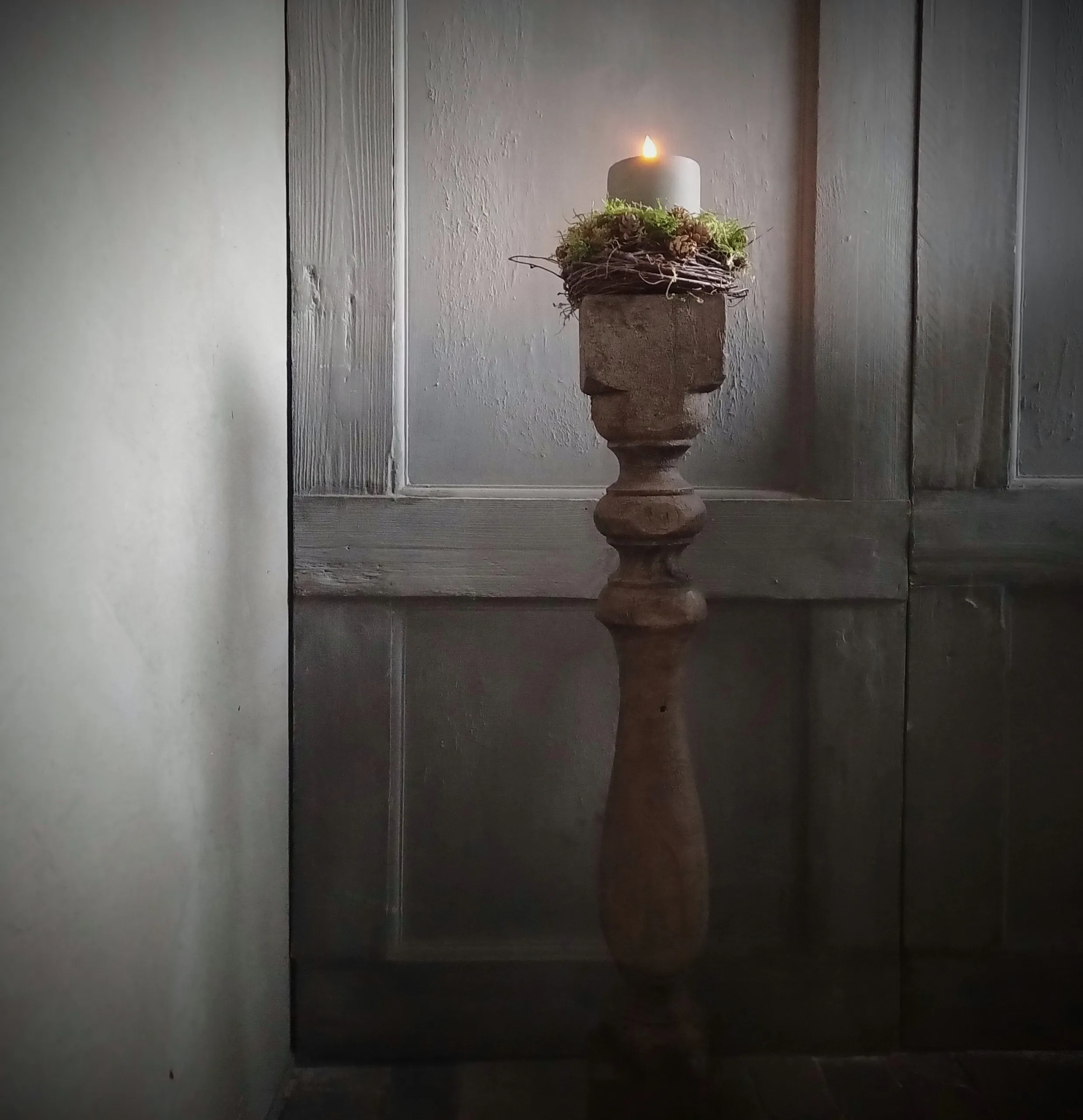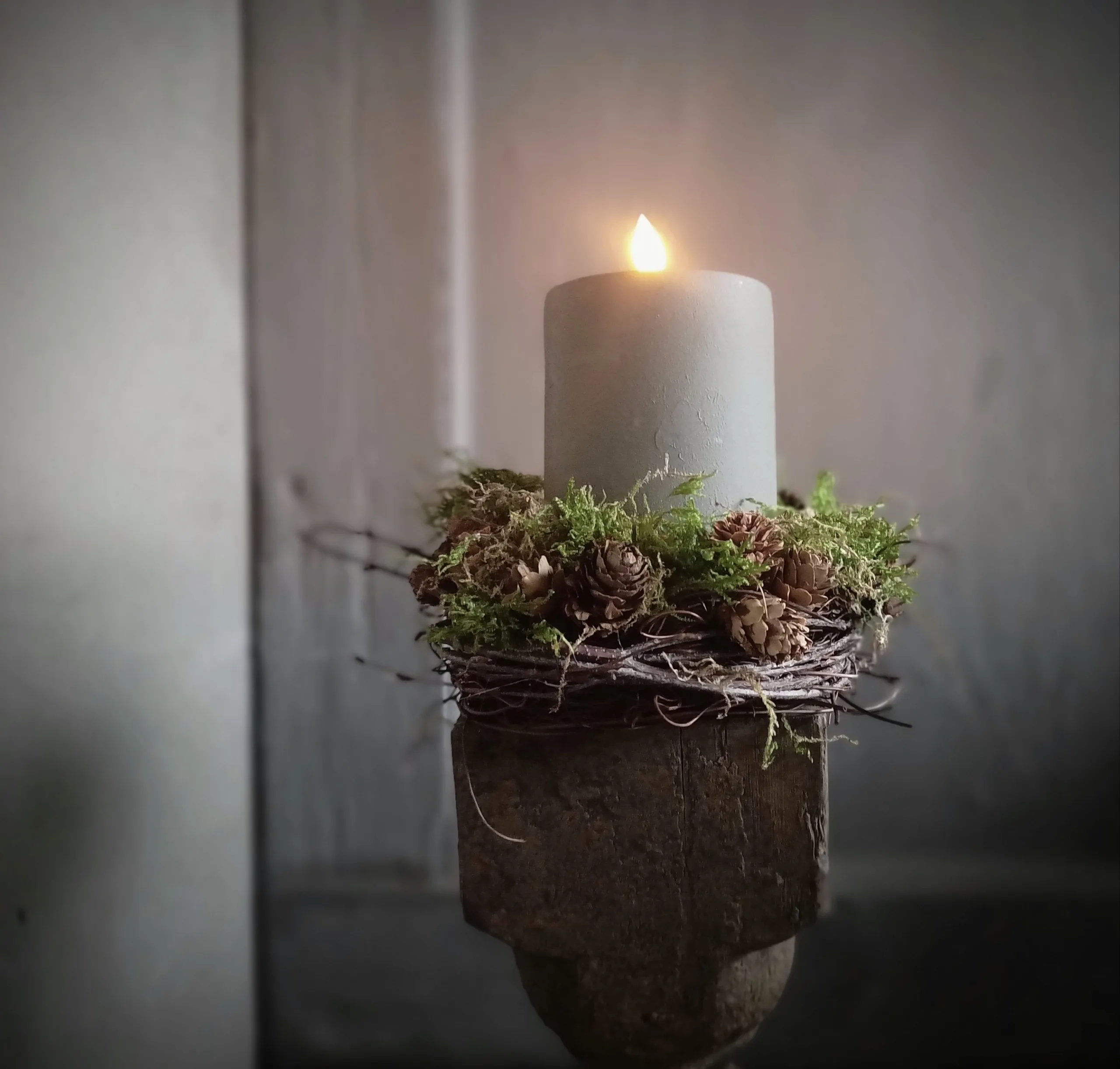 Geef extra sfeer aan je baluster, pot of kandekaar met dit kaars kransje van o.a. berk, lariks en mos. Doorsnee buitenzijde ongeveer 15 cm, binnenzijde ongeveer 7 cm zodat er een (led)stompkaars in past.
