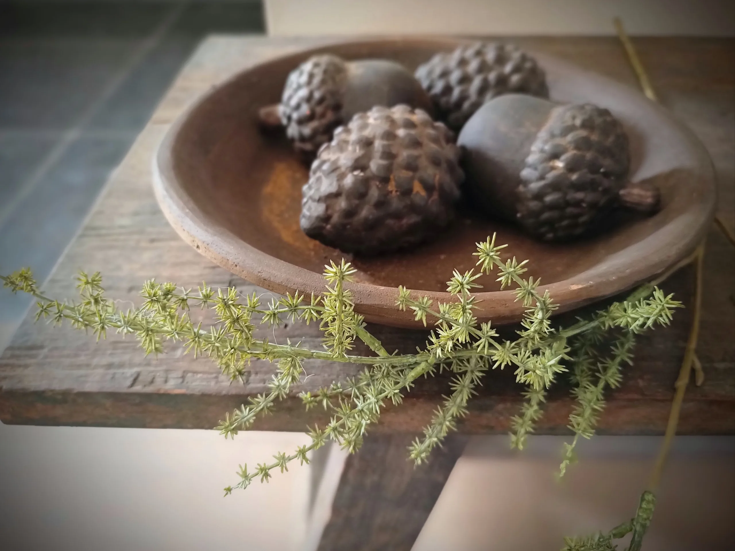 Keramiek set bestaande uit een eikel en dennenappel in vergrijsd bruine tint. Decoratief in een schaal of bak, maak het af met een (kunst) asparagus tak. Lengte van beide items ongeveer 9 cm. Breedte 6,5 cm. De onderzijde is vlak voor een stabiele plaatsing van de items.