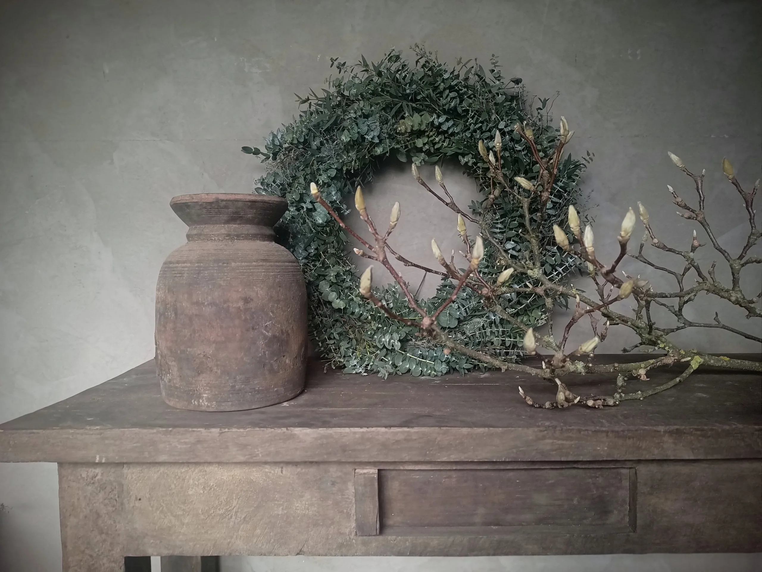 Deze heerlijk geurende krans wordt gebonden met diverse soorten eucalyptus en subtiel wat wilde thijm. Doorsnee ongeveer 50/55 cm.