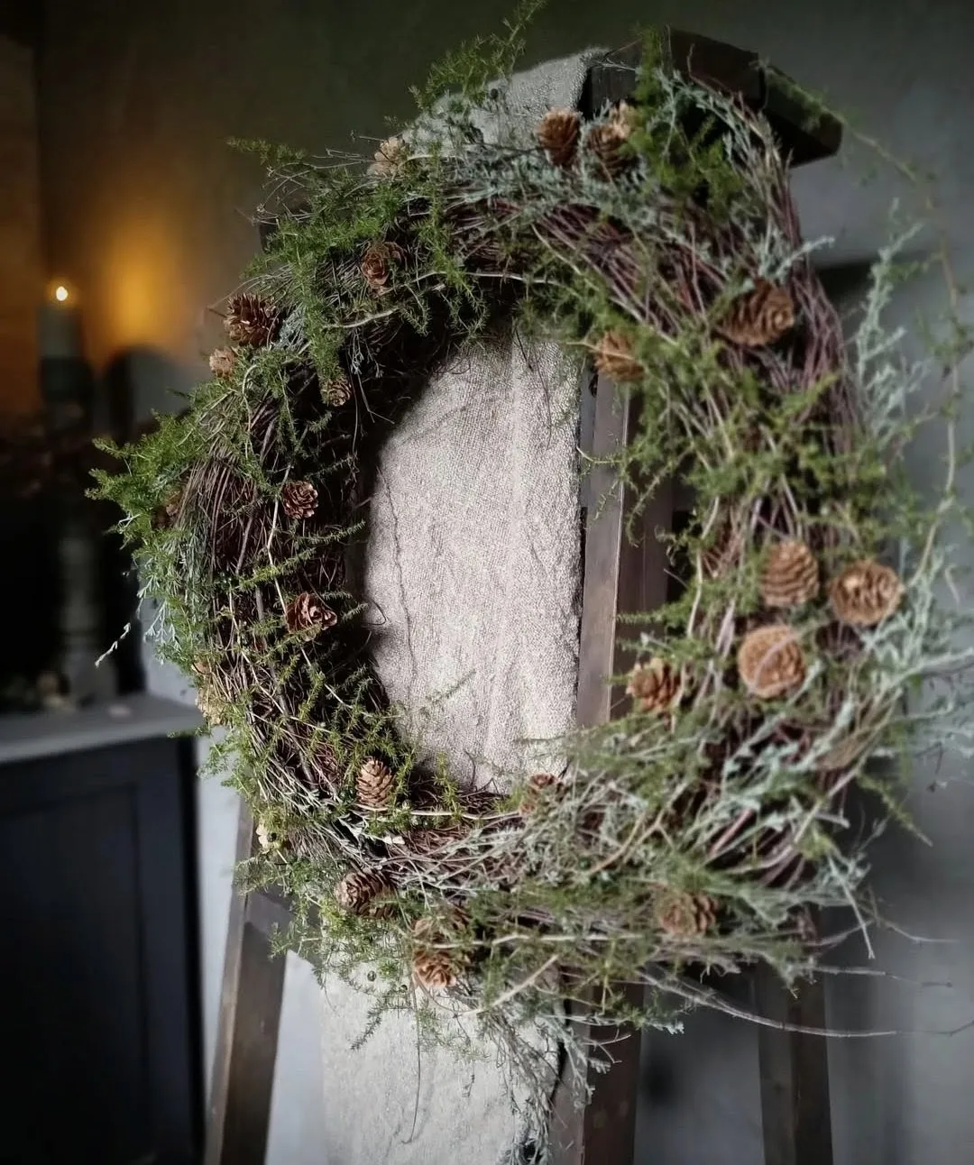 Wilde gebonden krans met salim, berk, asparagus en lariks denappeltjes. Subtiel afgewerkt met wat wilde thijm takjes. Doorsnee ongeveer 40 cm.
