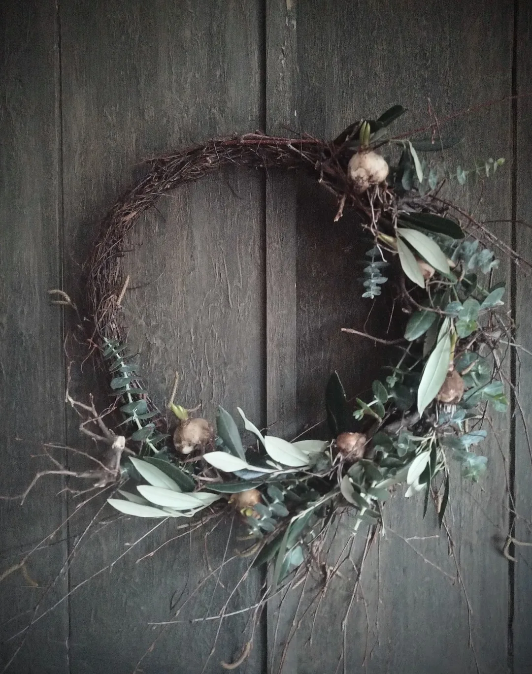 Kransje half gebonden met berkentakjes, bolletjes, olijf en eucalyptus. Mooi hangend aan je kast, regaal of deur. Doorsnee ongeveer 25 cm.