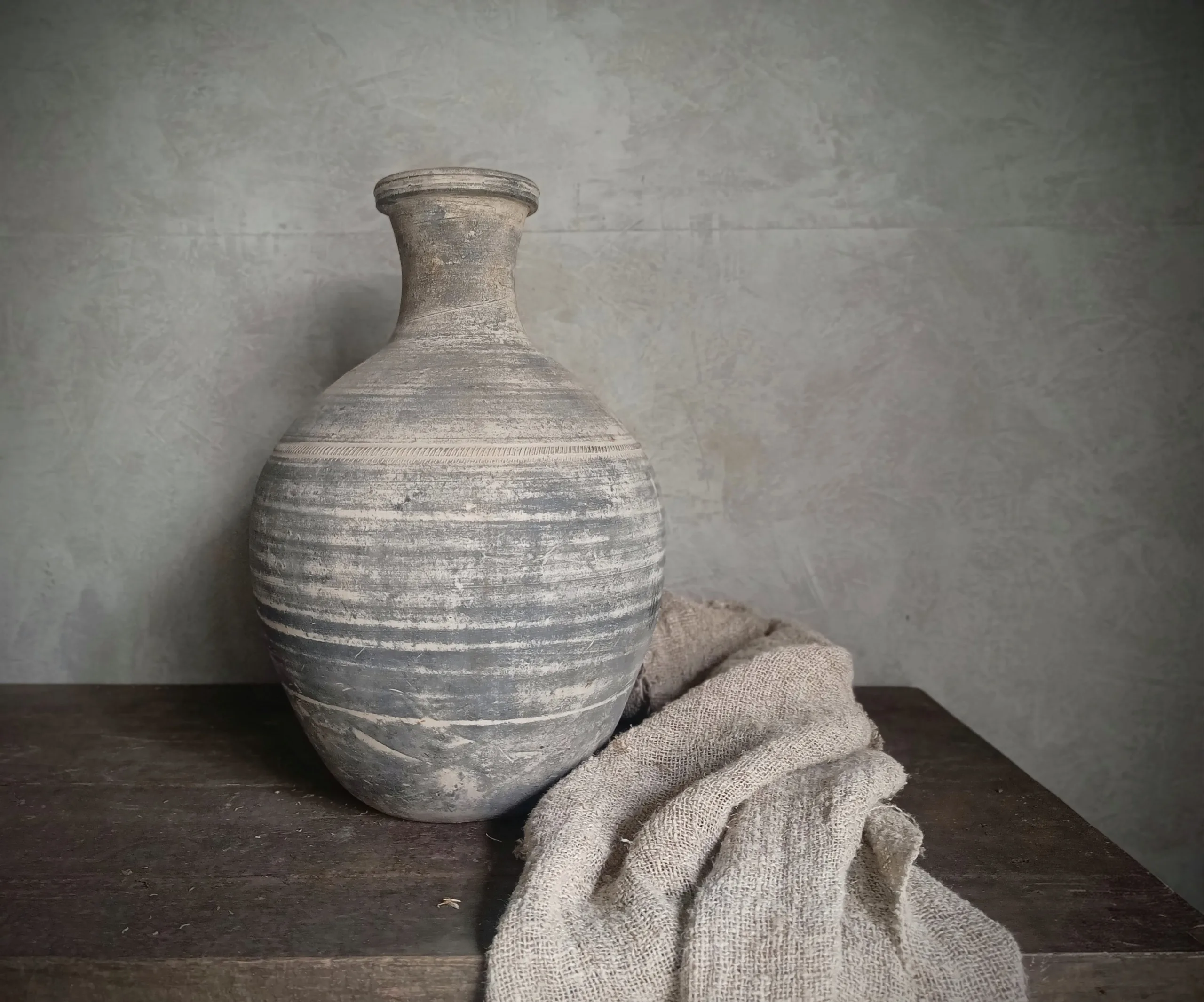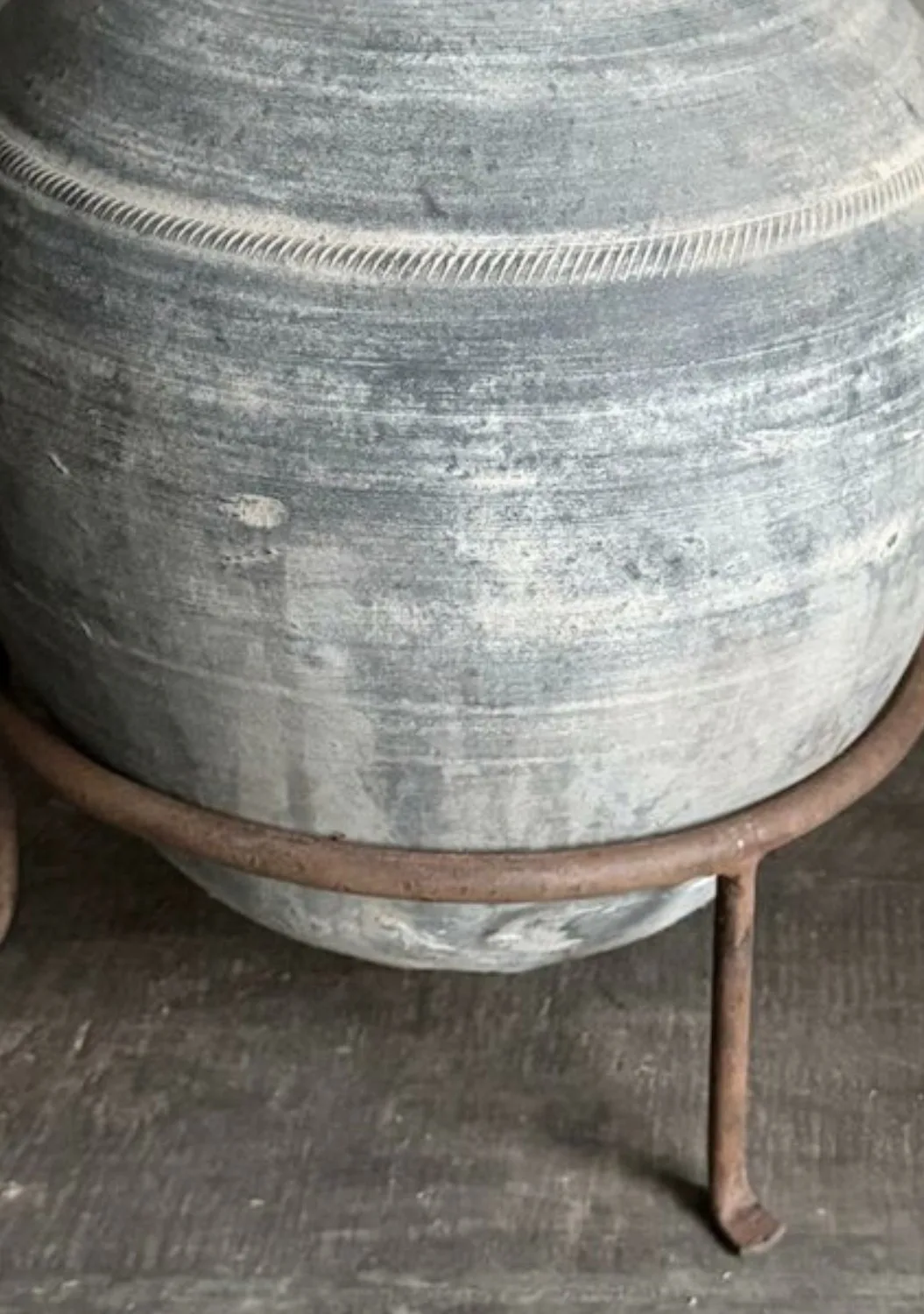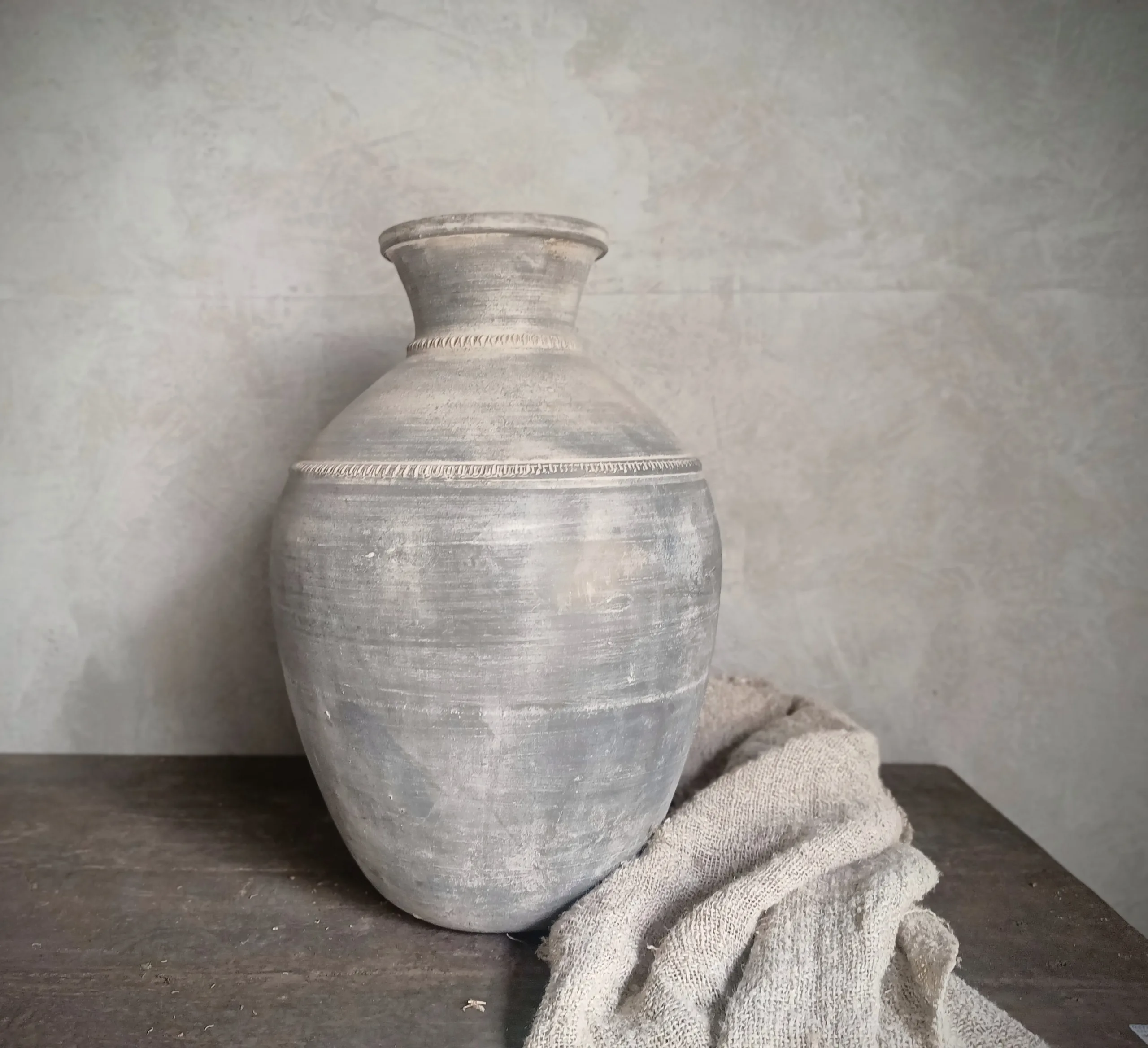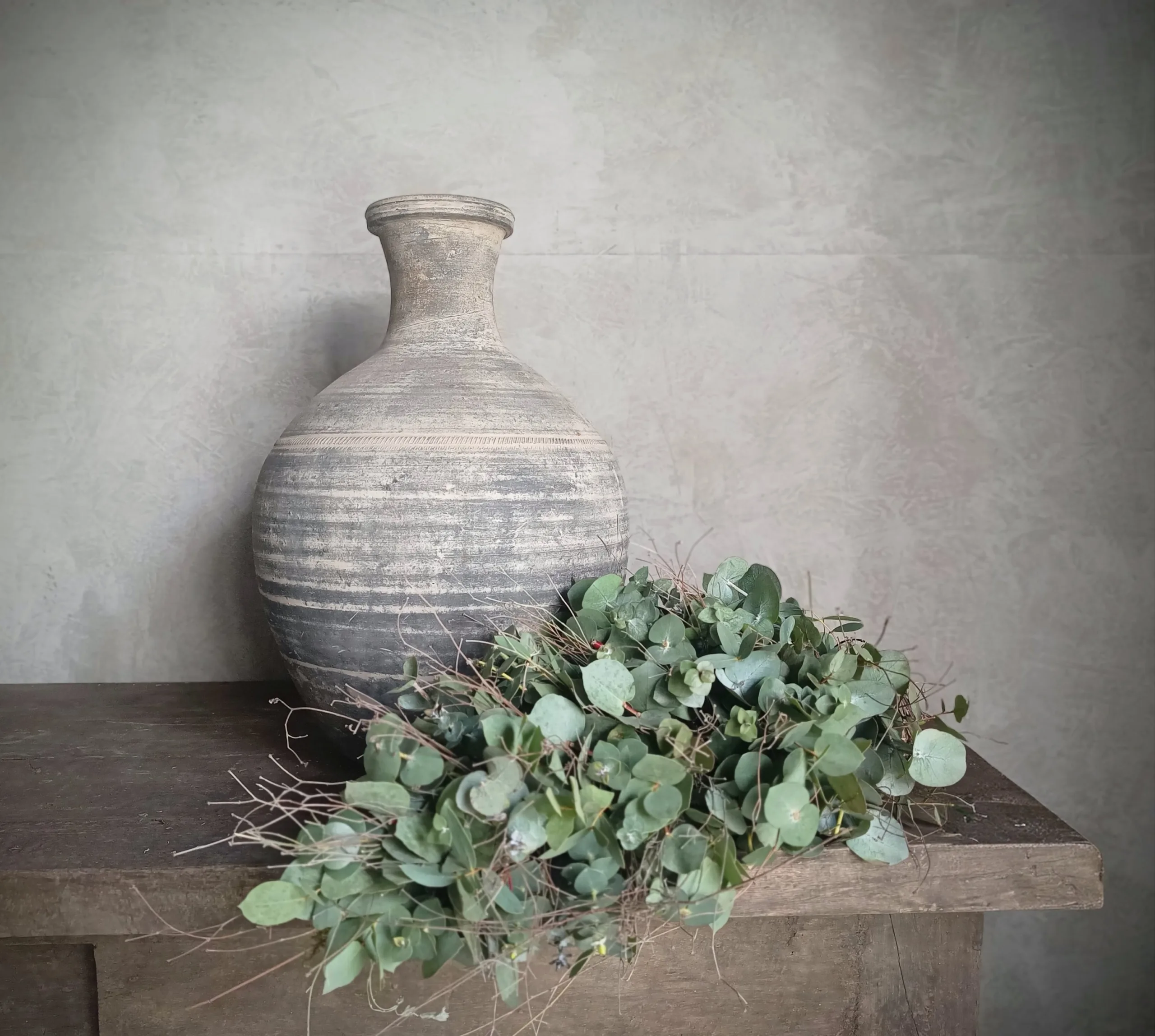 Deze kruik met hals is prachtig te decoreren in een vensterbank of op een sidetable. Of combineer ze met meerdere kruiken bij elkaar. De kleur is grijs/beige, de hoogte is 45 cm, de doorsnee 29 cm. De bodem is vlak zodat je deze met of zonder de bijgeleverde standaard kunt plaatsen. Let op dit artikel is kwetsbaar en wordt niet verzonden, bij bestelling vink aan “afhalen”.