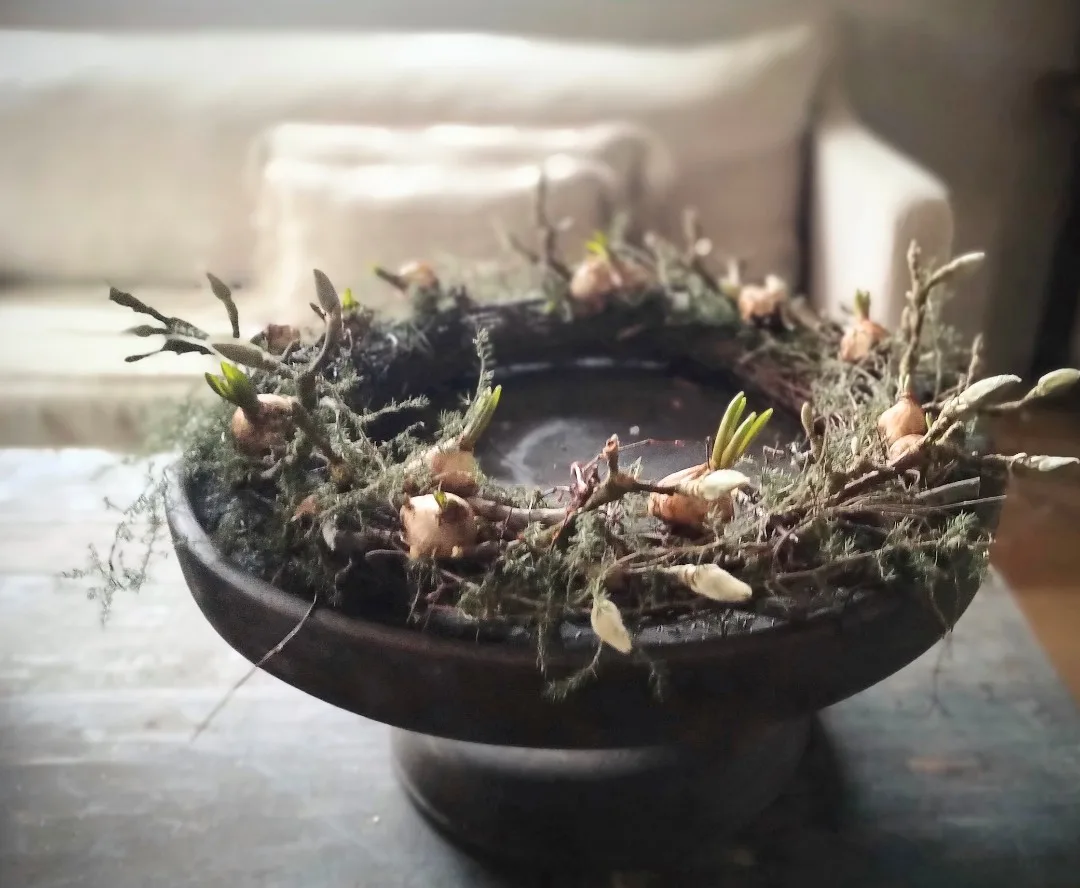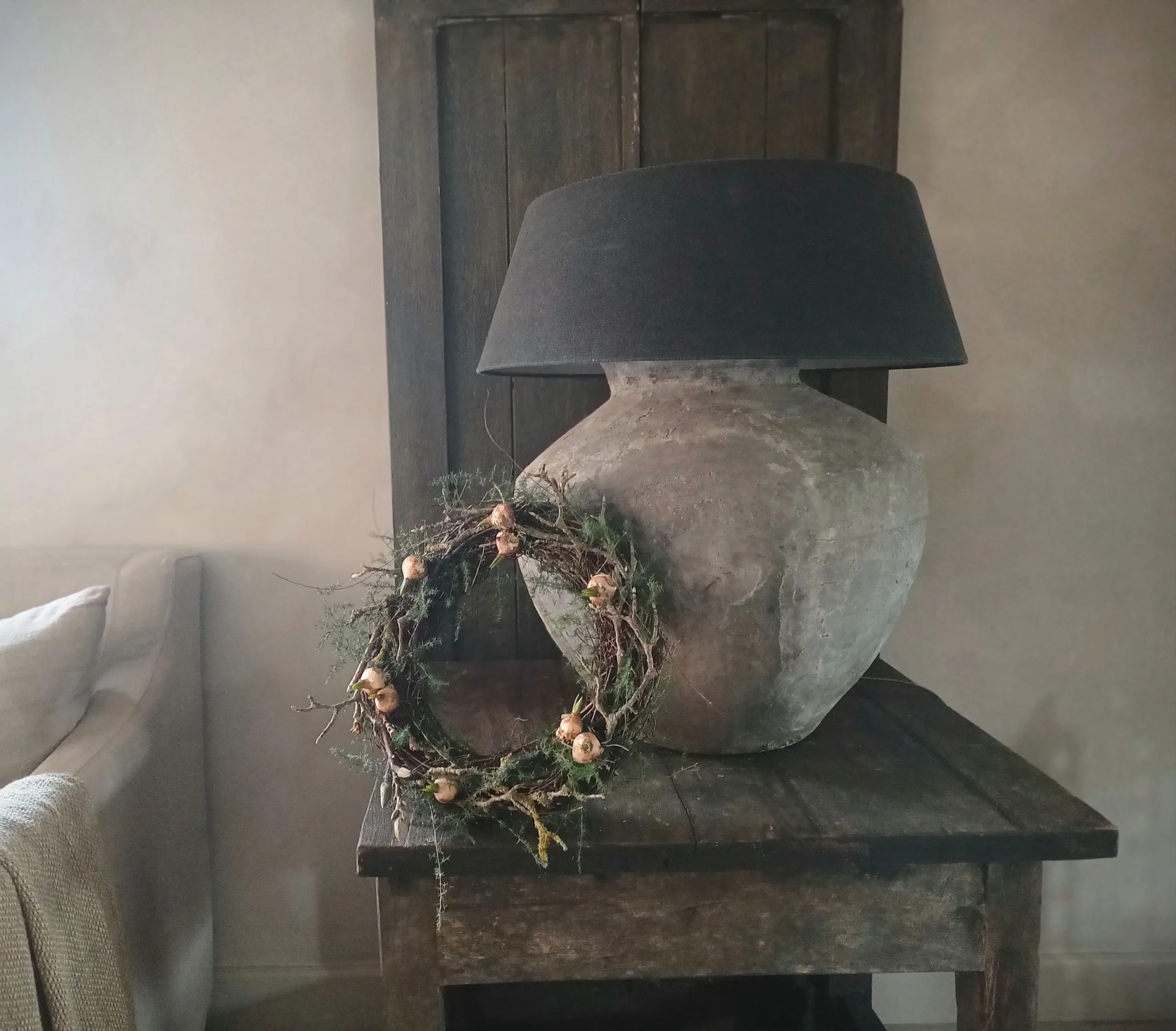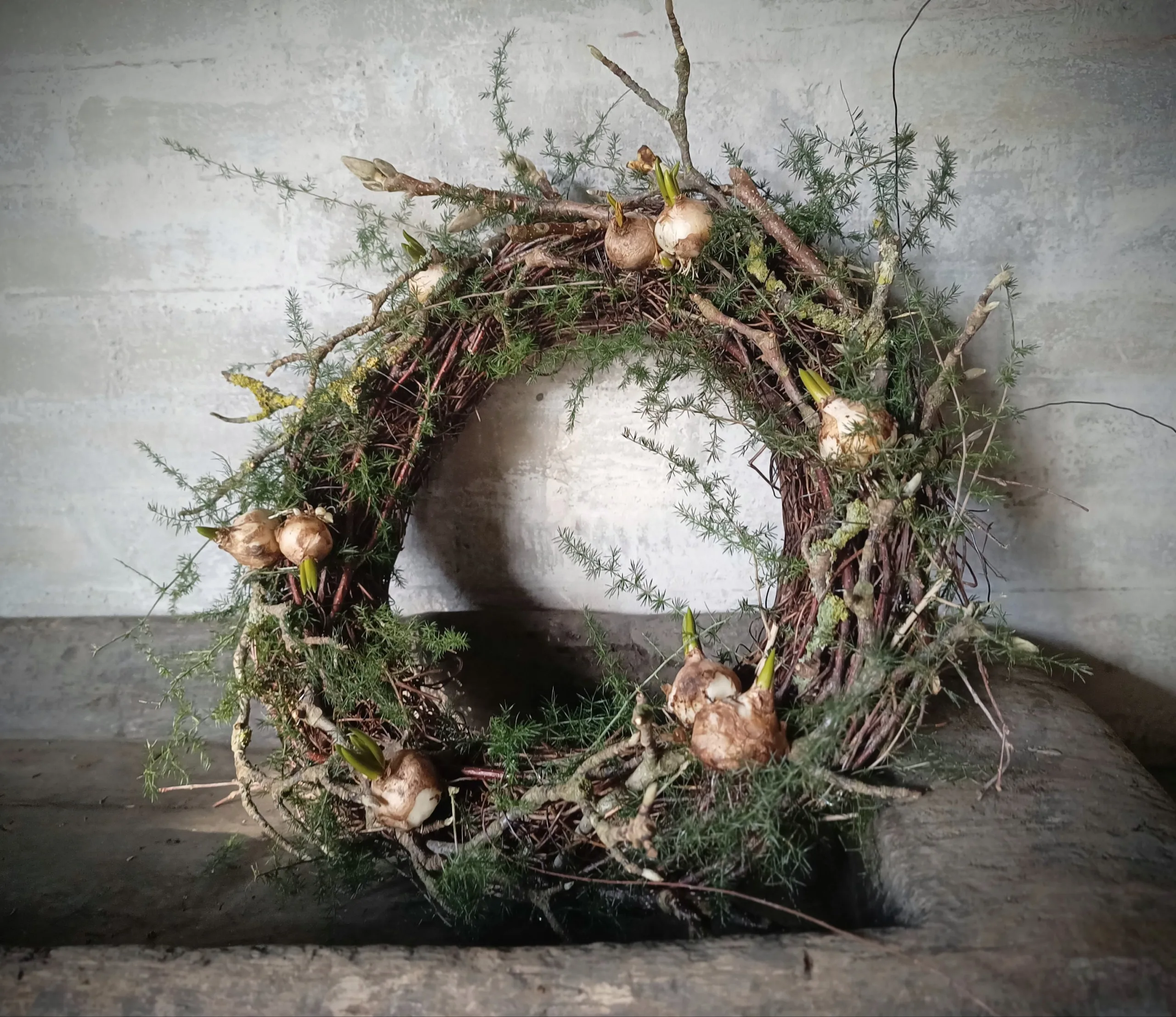 Krans gebonden met berk, magnolia, asparagus en afgewerkt met bolletjes van witte druifjes. Past ook mooi in het plateau Brix in de maat M. Doorsnee ongeveer 30 cm..