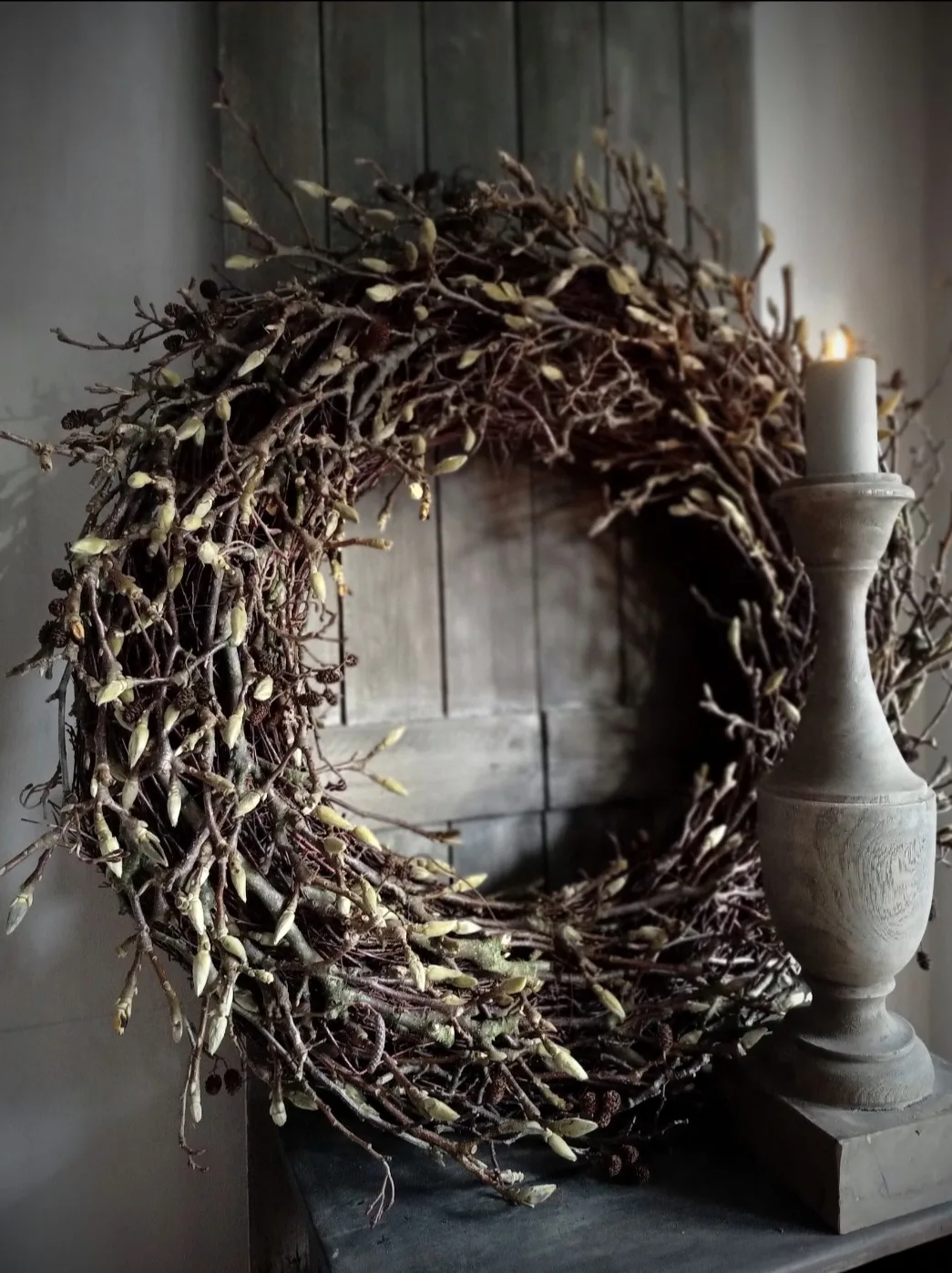 Vol gebonden krans met berken takken en magnolia. Doorsnee ongeveer 50 cm. Lang houdbaar.
