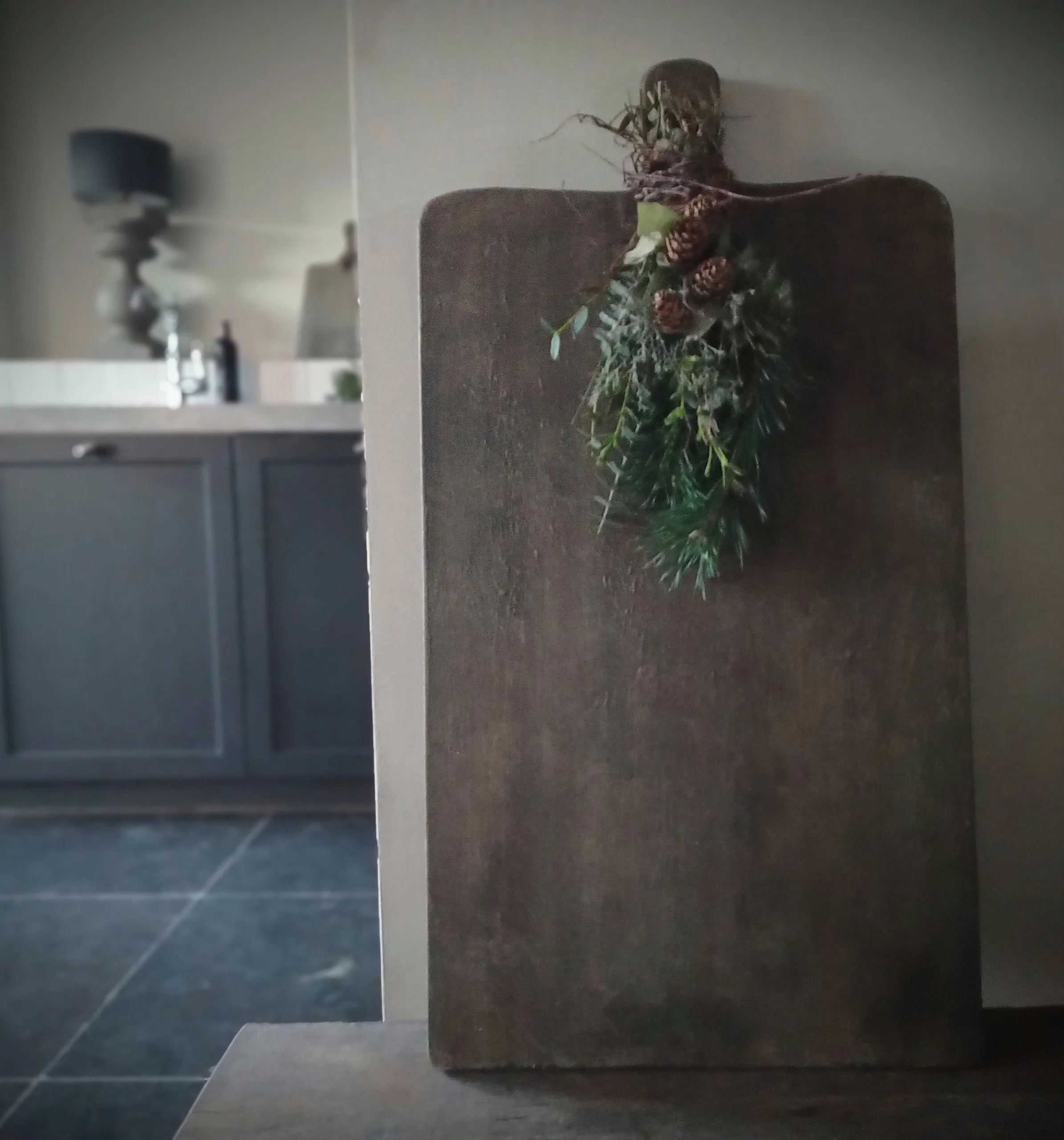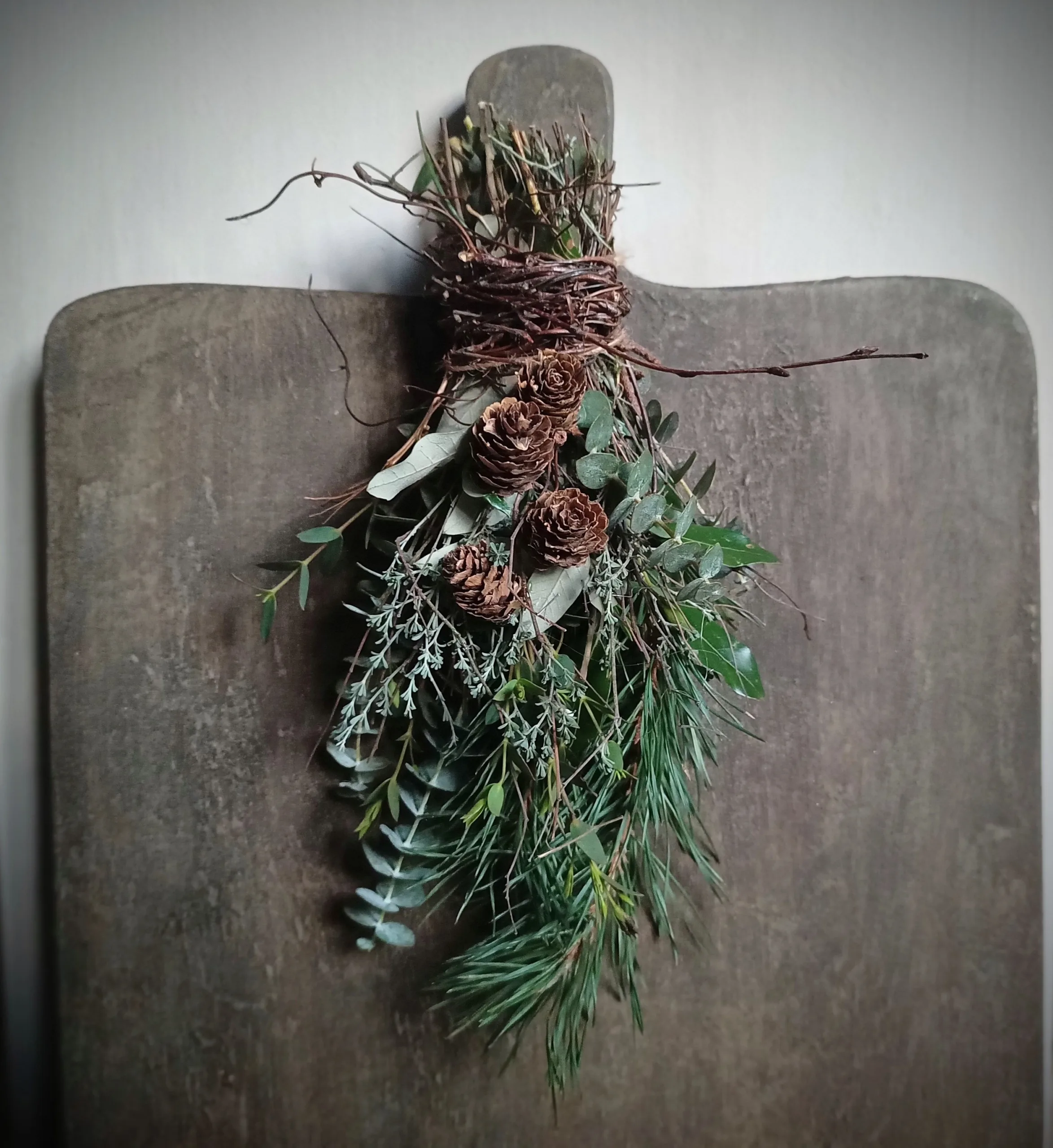 Toefje gebonden met divers groen waaronder pinustakjes en eucalyptus, leuk aan een broodplank of regaal. Afgewerkt met enkele lariks denappeltjes voor een kerst accent in je keuken. Lengte ongeveer 20-25 cm.