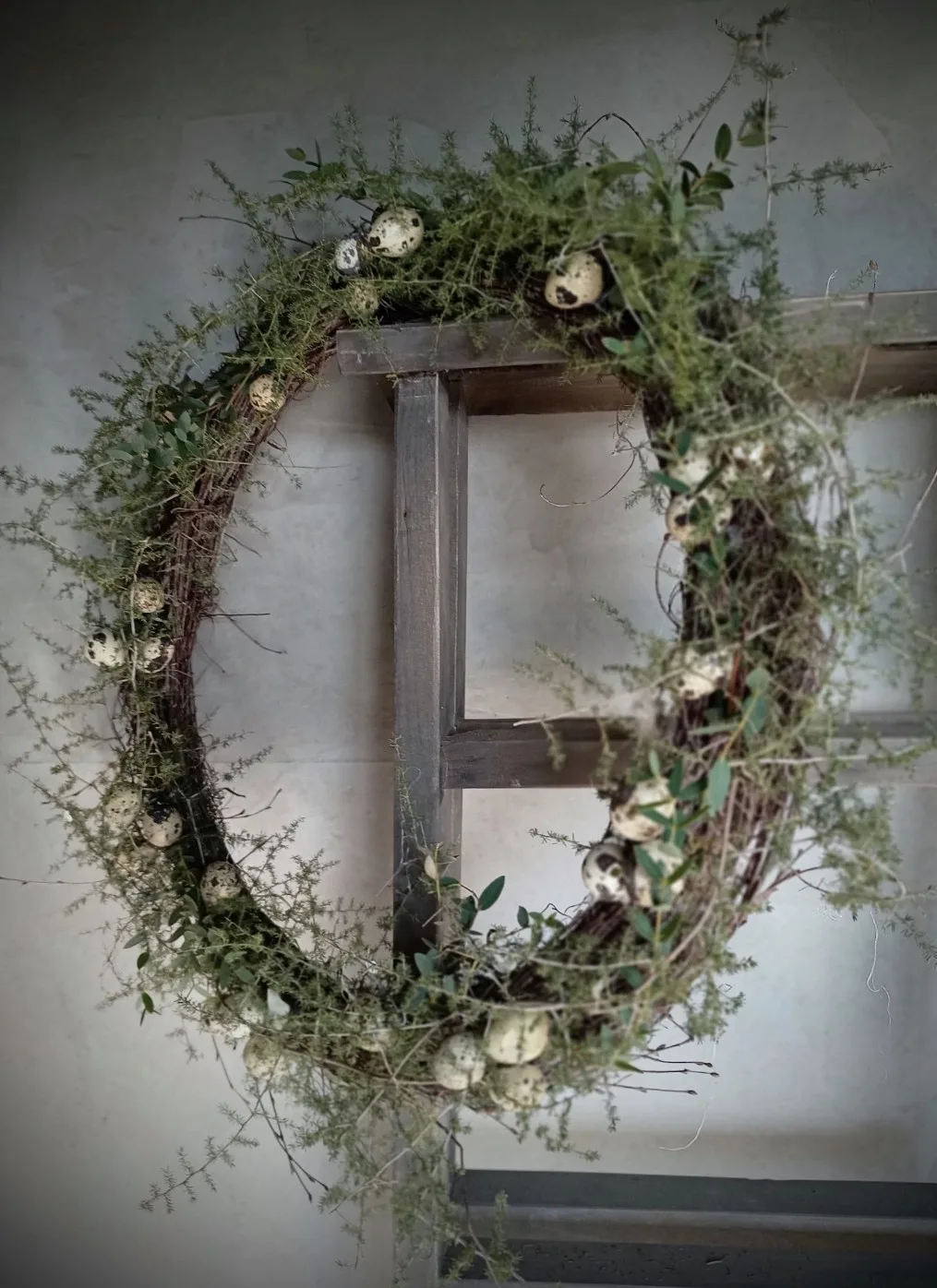 Deze fijne krans is licht ovaal van vorm en wordt gebonden met berkentakjes, asparagus, fijne eucalyptus en afgewerkt met kwarteleitjes. Lengte ongeveer 40 cm, doorsnee ongeveer 25/30 cm.
