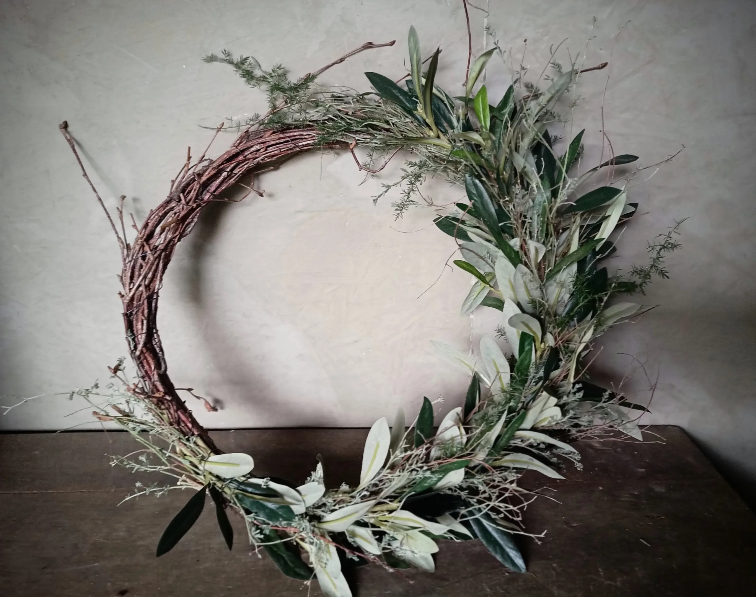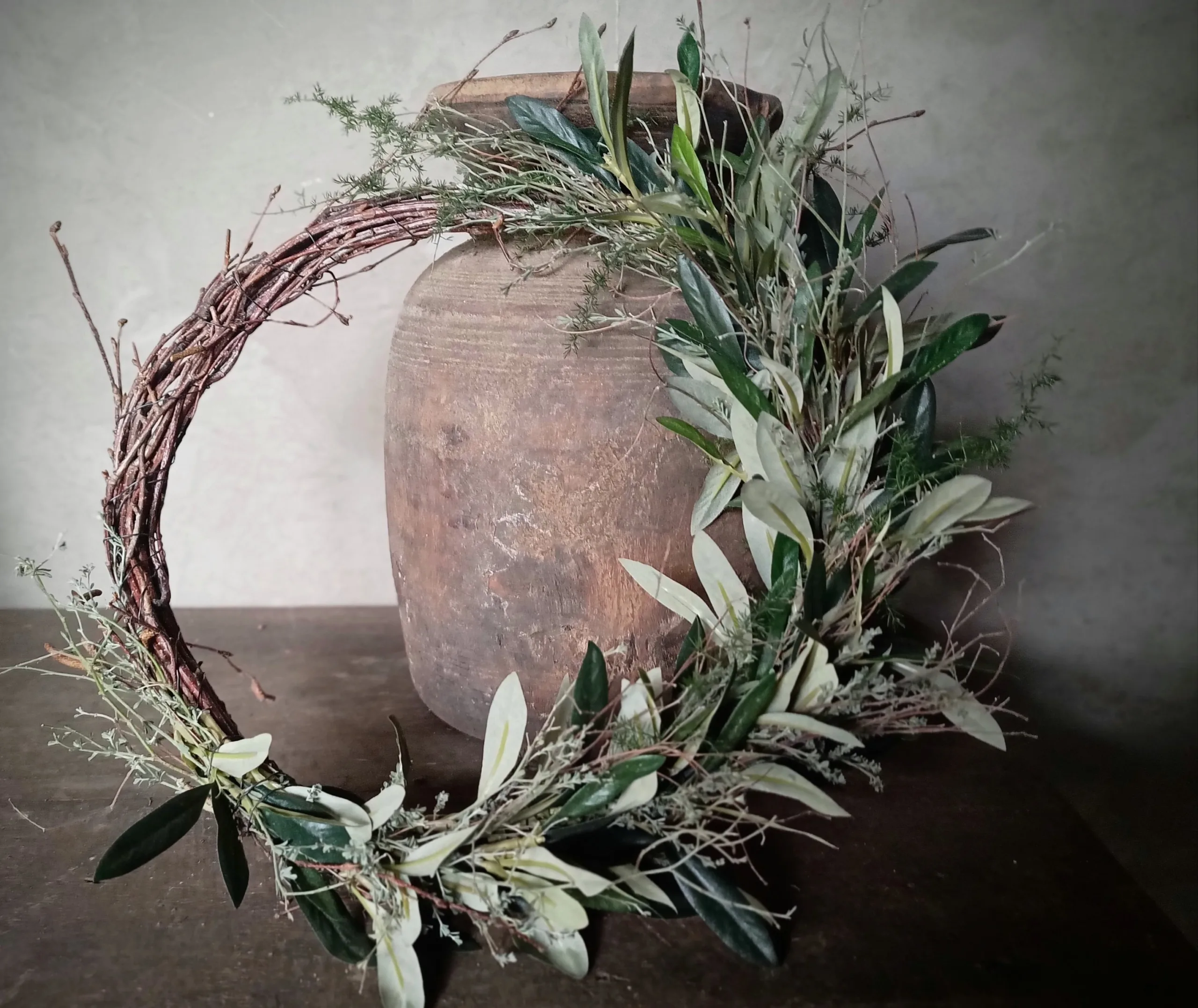 Wil je lang plezier van je krans hebben kies dan voor deze met kunst olijftakjes gebonden ringkrans. Mede door de combinatie van echte wilde thijm is de olijf niet van echt te onderscheiden. Doorsnee ongeveer 30/35 cm.
