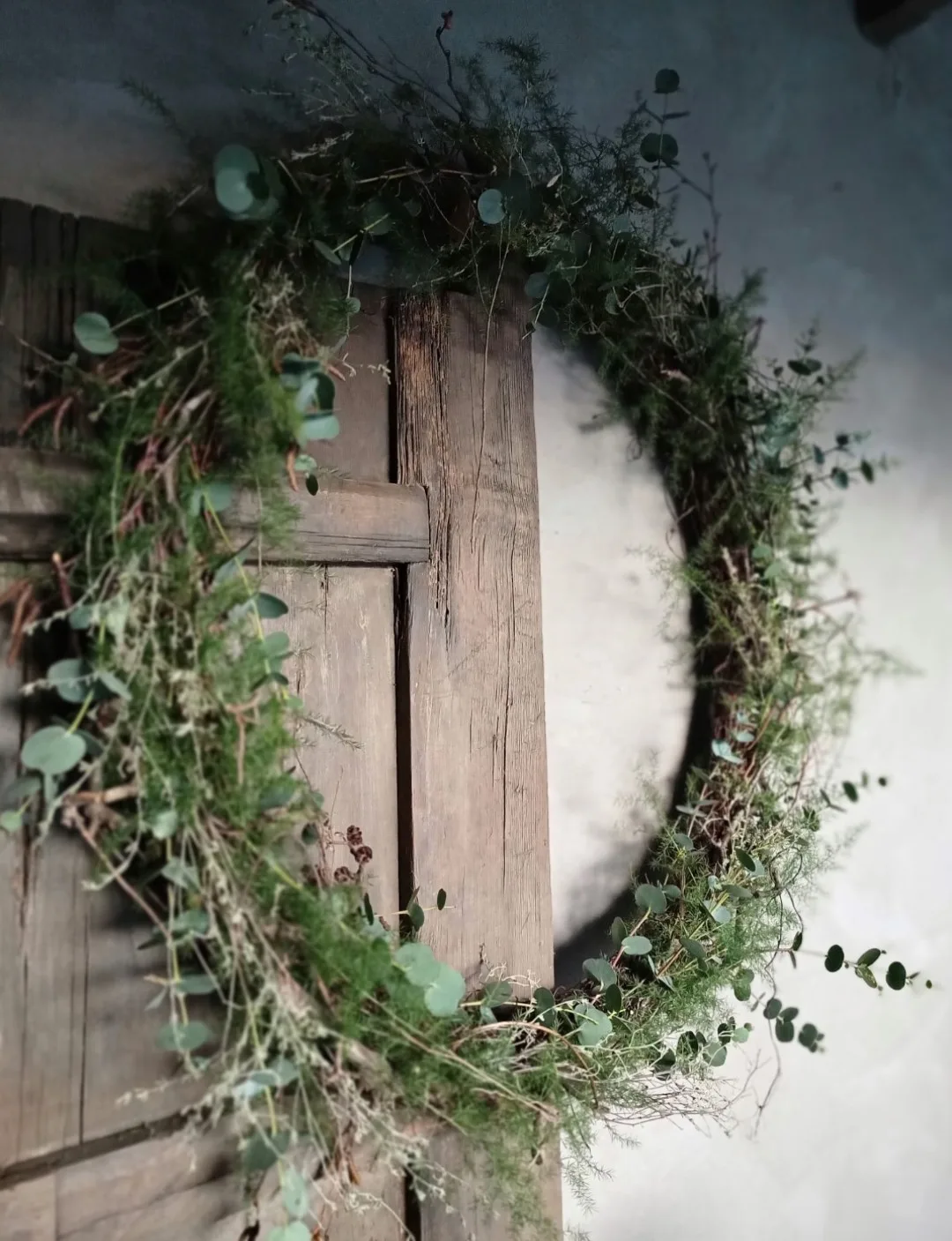 Smal gebonden krans met berken takjes, wilde thijm en los gebonden eucalyptus. Doorsnee ongeveer 45 cm.
