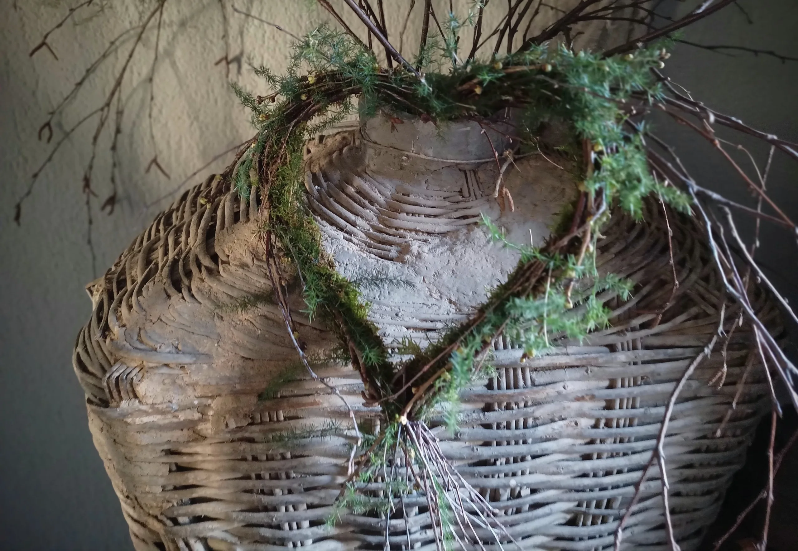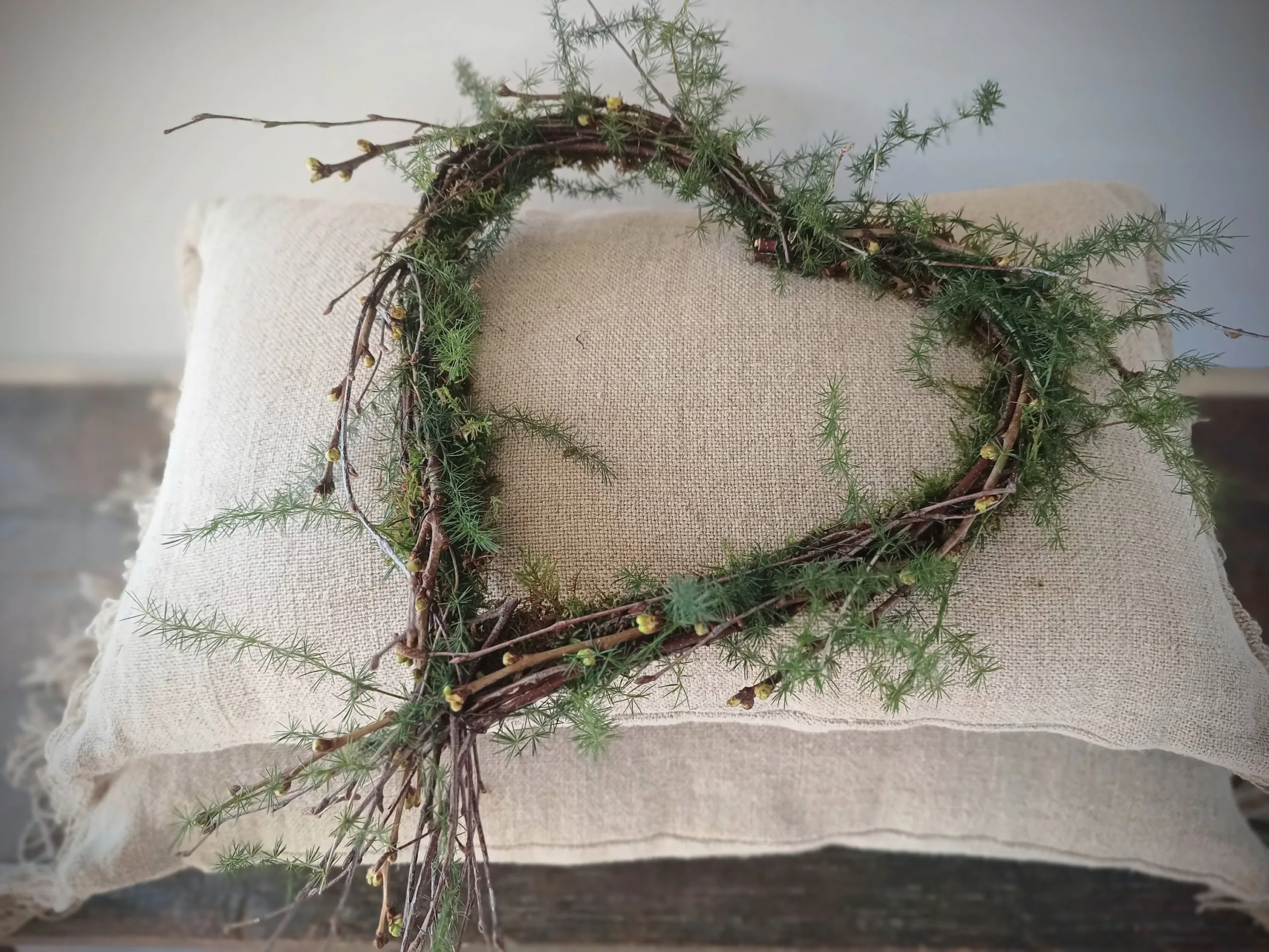 Het hart wordt gebonden met berkentakjes, kersenbloesem en asparagus. Voor een sobere maar frisse uitstraling. Hoogte ongeveer 30 cm. Een voordelige keuze als give away item.